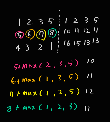 map[rowIdx][nextIdx] += currentMax; //현재 행의 원소에 이전 행에서 가져올 수 있는 최선의 최대 값을 엎어침 -> 다음 행 에서도 결과적으로 이전 행이 수행한 최선의 값을 넘겨줌