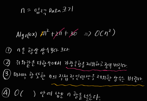 대표적으로 피타고라스의 정리는 빗변의 길이를 구하기 위한 알고리즘이라고 볼 수 있으며 컴퓨터 공학에서 알고리즘은 대부분 기존에 일반적인 방식으로 진행 시 소모되던 시간을 더 줄일 수 있는 새로운 방법이라고 생각한다. 그렇기 때문에 알고리즘은 도출할 수 있는 모든 결과 중에서도 거의 최악에 가까운 경우의 수를 판단하는 지표로 보고 해당 경우의 수 이내에 작업이 수행된다고 판단한다. 그래서 대부분의 알고리즘 Big-O 표기법이라고 하는 점근적 표기법으로 입력에 따른 수행시간을 나타낼 수 있으며 이를 시간 복잡도라고도 한다.