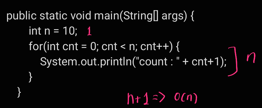 실제로 수학적 식으로 표현하면 약간 다르지만 기본적으로 필자가 적은 방법대로 시간 복잡도를 구하면 쉽게 시간 복잡도를 구할 수 있다. 여기서 코드를 보고 직접 시간 복잡도를 구해보도록 하자.
