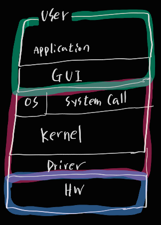 HW 즉 디바이스를 위한 프로그램이다. 이전에 사용자가 OS 와 소통하기 위해 GUI 를 사용한다면 HW 는 OS 와 소통하기 위해 드라이버가 있어야한다. HW 가 시스템 기능을 사용할 수 있게 해주며 직접적으로 시스템 함수에 접근이 가능하다.