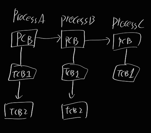 프로세스의 스레드의 독립된 고유 정보는 프로세스의 PCB 와 마찬가지로 Thread Control Block 인 TCB 로 관리되며 TID, PCB Pointer(어떤 PCB 의 Thread 인지), Next TCB Pointer, 상태, 레지스터 같은 정보들을 가지고 있다.