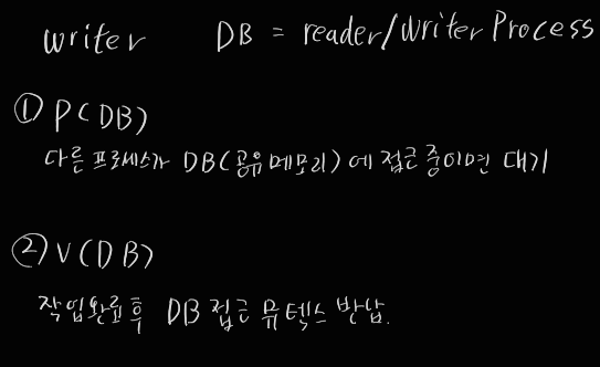 먼저 Writer 프로세스의 경우에는 기본 뮤텍스 프로세스 동기화와 마찬가지로 Write 중에는 다른 어떠한 프로세스도 접하지 못하도록 한다.