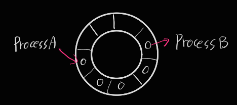 중간의 원형 큐가 프로세스 A 와 프로세스 B 의 공유 버퍼(서로 접근하는 공유 메모리)라고 가정하자. 이때 A 는 항상 버퍼 큐에 데이터를 입력하고 반대로 B 는 항상 버퍼에서 데이터를 꺼내간다. 따라서 A 는 생산자, B 는 소비자의 역할이다. 우리는 프로세스 동기화에 의해 기본적으로 프로세스들의 공유 공간은 세마포어로 읽기와 쓰기가 동시에 일어나며 발생하는 데이터 불일치를 방지된다는 것을 알고 있다.