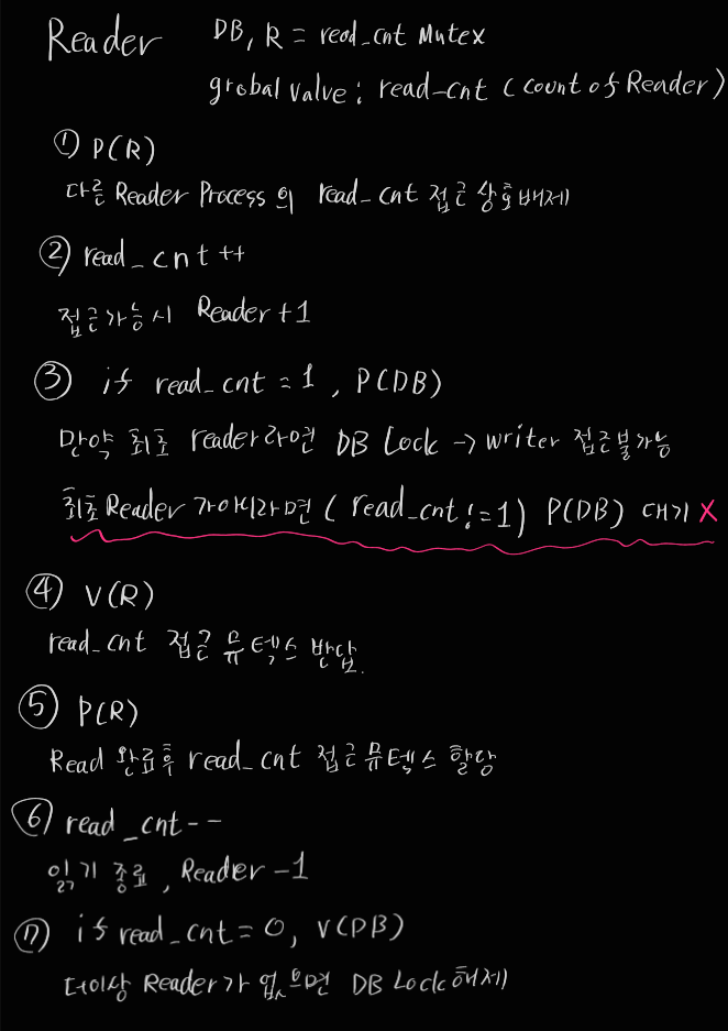 Reader 의 경우에는 공유 변수를 추가로 사용해 현재 Reader 프로세스의 수를 확인한다. 일단 공유 변수에 접근하는 것 또한 Write 이기에 공유 변수를 위한 뮤텍스 R 을 할당받으면 진행하며 read_cnt 를 1 증가시킨다. 이후 최초 Reader 확인 후 자신이 최초라면 현재 공유 메모리에 접근 중인 프로세스가 있는지 확인하고 (다른 Reader 는 없을테니 Witer 접근 확인) 뮤텍스를 할당 받는다. 이후 작업을 진행하며 최초 이후 Reader 들은 DB 뮤텍스 확인 없이 read_cnt 만 수정하며 작업을 진행하게 되어 결과적으로 여러 Reader 가 동시에 공유 데이터에 접근할 수 있다. 이후 작업을 완료하면 read_cnt 를 감소시키고 공유 데이터에 접근 중인 Reader 가 없을 경우 Writer 가 공유 데이터 접근할 수 있게 DB 뮤텍스를 반납한다.