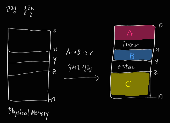 동적 로딩과 동일하게 프로세스 코드 실행 간 필요한 코드만 메모리에 올려서 사용하는 기법이다. 단 오버레이의 경우 OS 라이브러리 기능을 사용하는 것이 아닌 개발자가 직접 설계하는 것으로 기억장치의 기술이 지금만큼 발전하지 않던 시절 사용하던 기법이다.